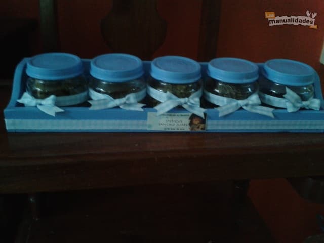 Recuerda darle unas dos o tres manos de pintura a la base de madera en la que colocarás los frascos pequeños. De esta forma, podrás concentrar el color y lograr un resultado aún más atractivo.