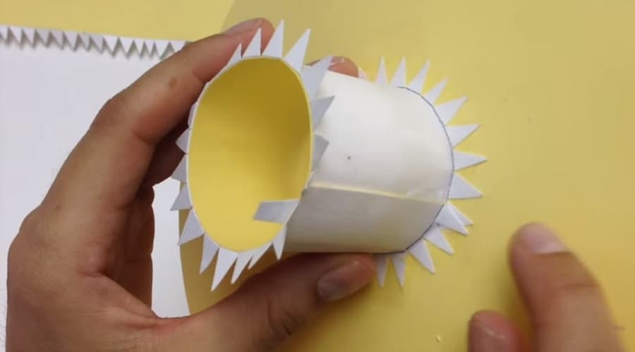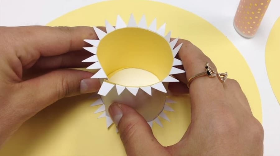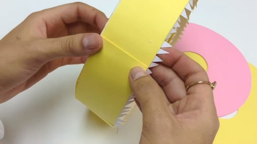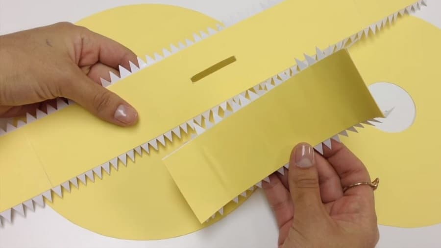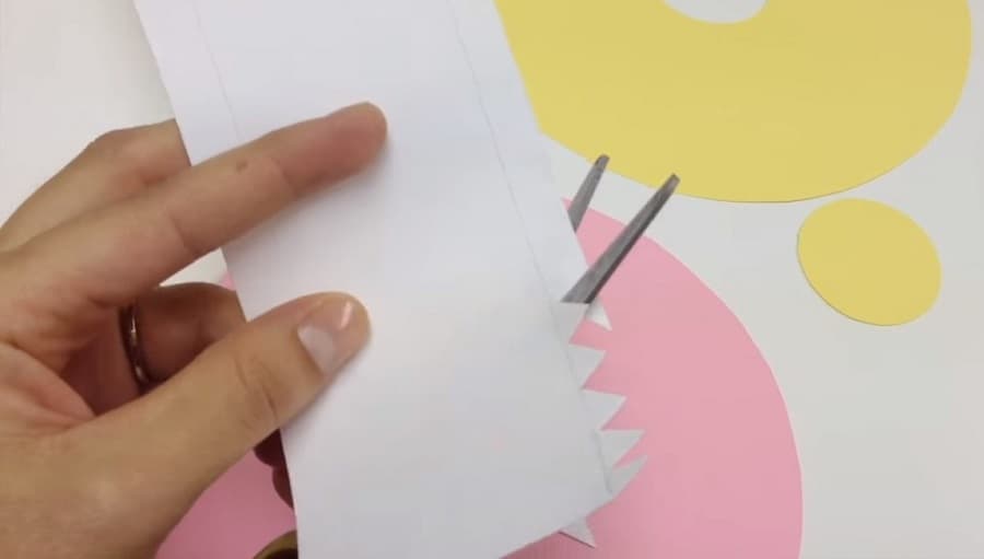 Paso 6. Recorta otra tira en la cartulina. Debe ser de 7 cm de ancho por un largo, que al unirlo abarque el espacio de los círculos internos en la dona. Haz los picos.