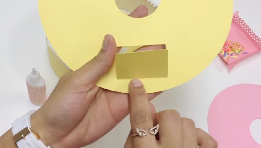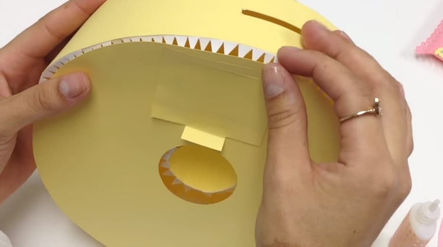 Paso 14. Pega el segundo círculo a la tira de la cartulina. Checa que la “ventanita” quede justo enfrente del triángulo por donde meterás las monedas.