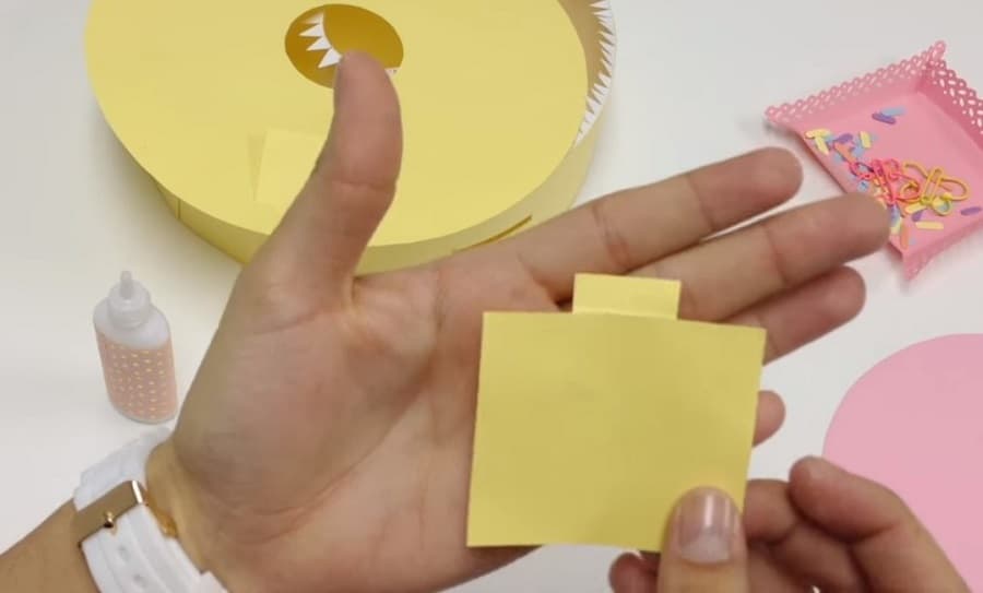 Paso 12. Por separado recorta un cuadrado en la cartulina (que sea más grande que del tamaño del que acabas de cortar en el círculo). Y pégale una pestañita con otro pedazo de papel.