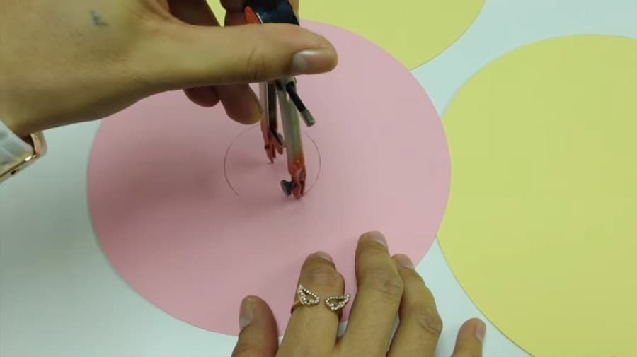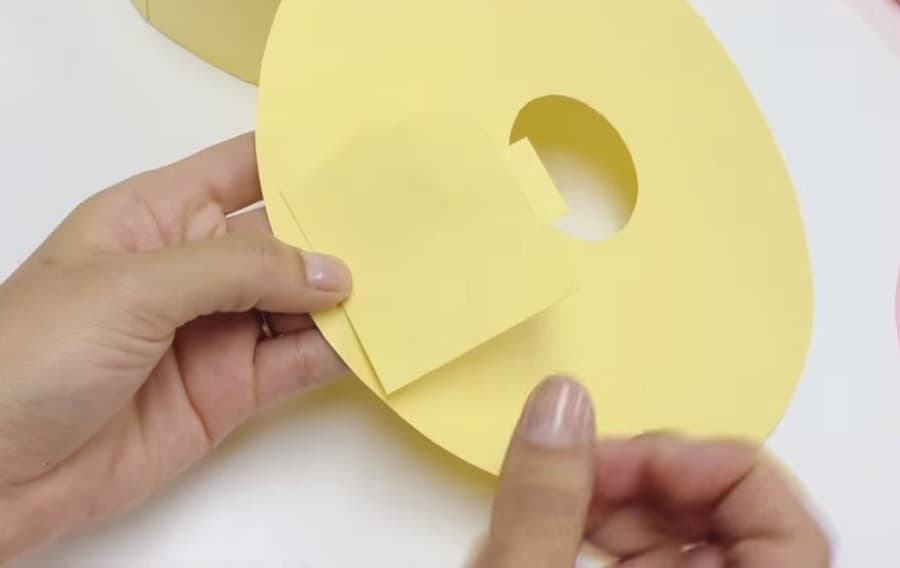 Paso 1. Dibuja en las hojas dos círculos grandes de color amarillo pálido y uno más pequeño en rosa. Recórtalos.