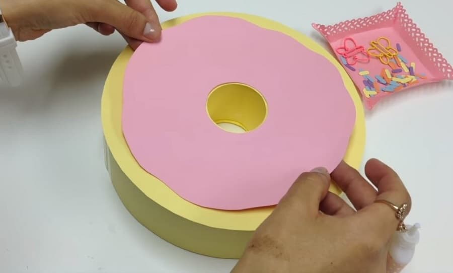 Paso 7. Pon un poco de pegamento en la circunferencia interna de uno de los círculos amarillos, en el que es la parte del centro de la dona, y pega la tira más pequeña.