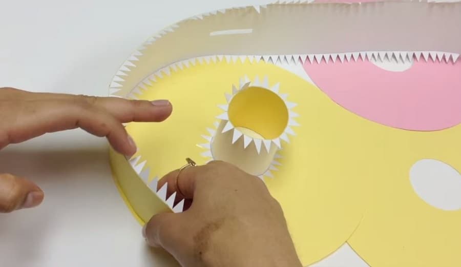 Paso 15. Recorta ondas en la orilla del círculo rosa, para darle forma dispareja. Y pégalo encima de uno de los círculos amarillos.