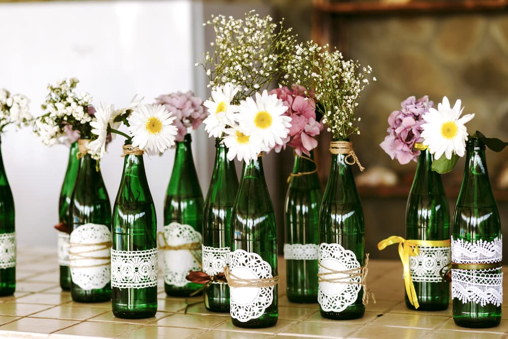 Si de elementos decorativos se trata, ¿qué mejor ejemplo que unas botellas antiguas (o no)? Además, aunque por si solas pueden tener mucha fuerza, también puedes refrescarlas aun más colocando en ellas tus flores favoritas.