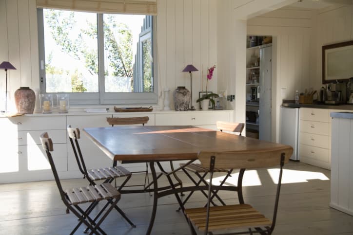 Para tener una cocina típicamente campestre, deberás combinar el blanco de los gabinetes con el marrón de las mesas y sillas de madera.