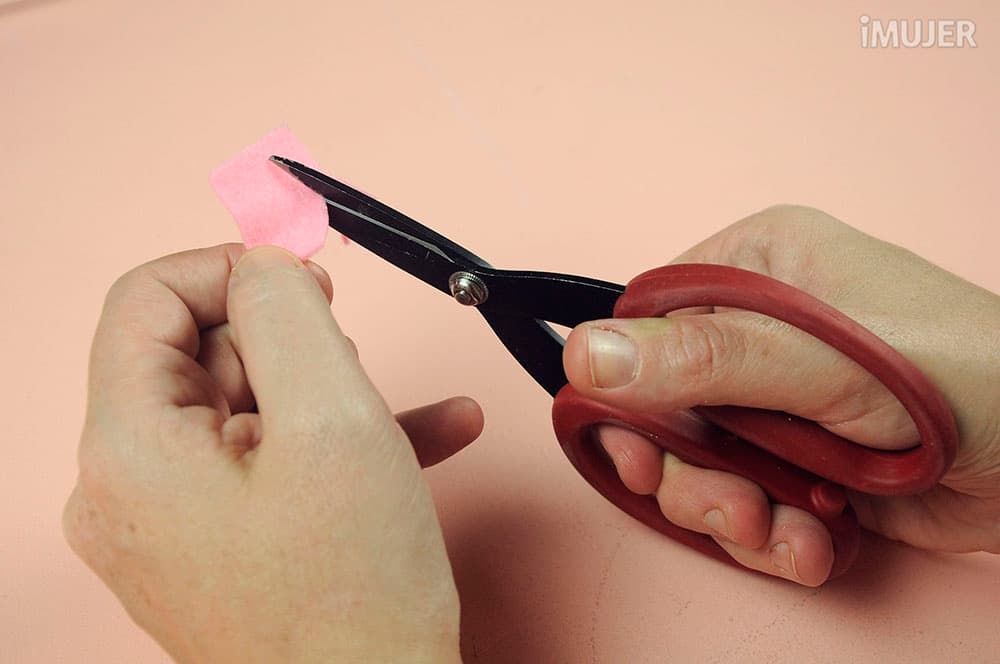 Usa la tijera para cortar un corazón de fieltro rosa. Asegúrate que sea pequeño.