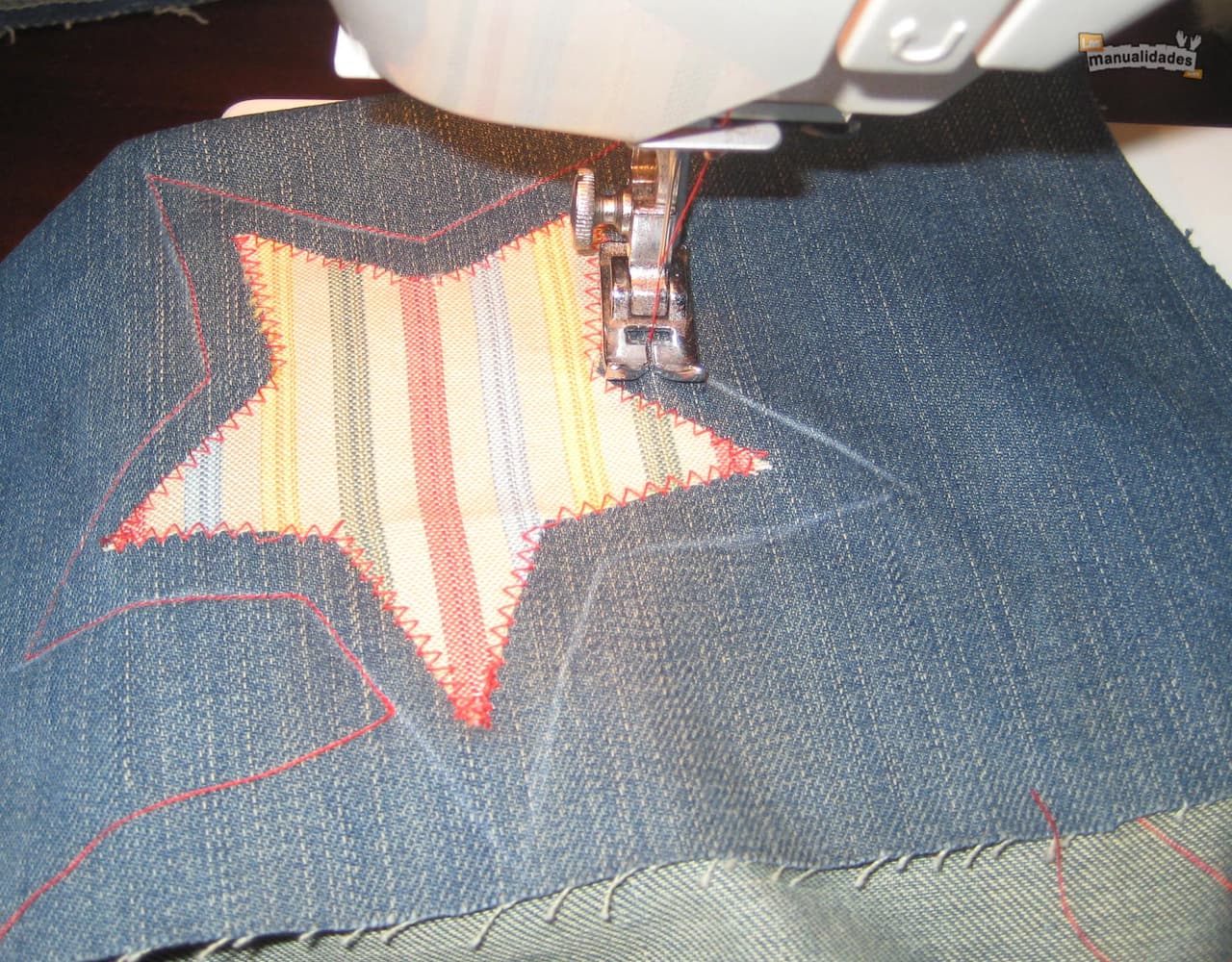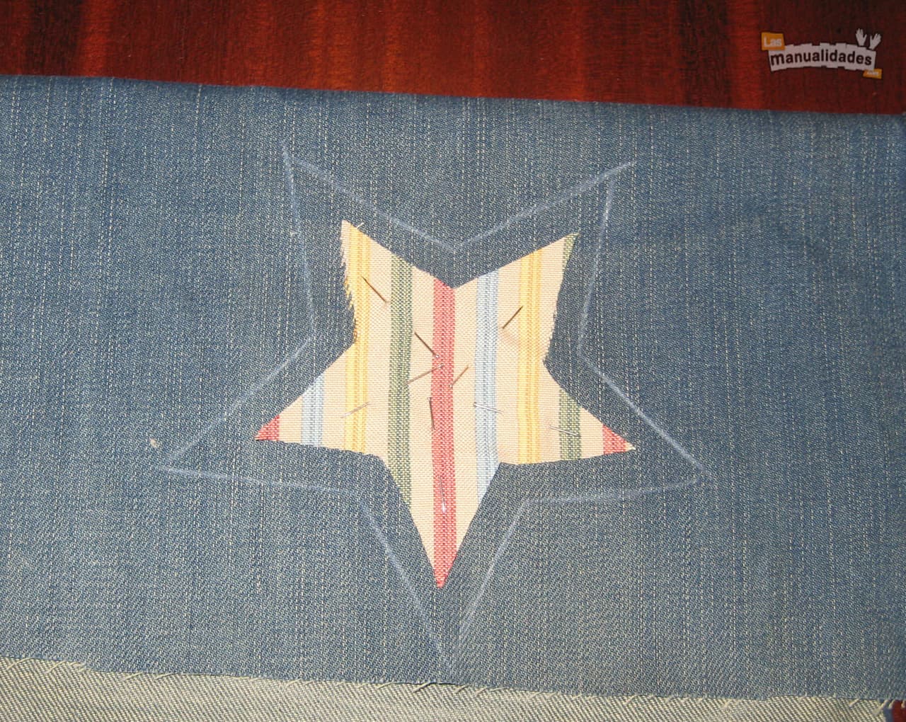 Sobre la tela vaquera dibuja la estrella grande. Recorta una estrella pequeña en la tela estampada y colócala en el centro. Sujétala con alfileres para que no se mueva mientras la coses.