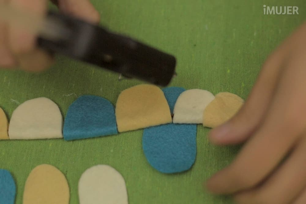 Una vez que tengas una línea de figuras de fieltro sobre la cadena, coloca otra superponiendo las piezas.