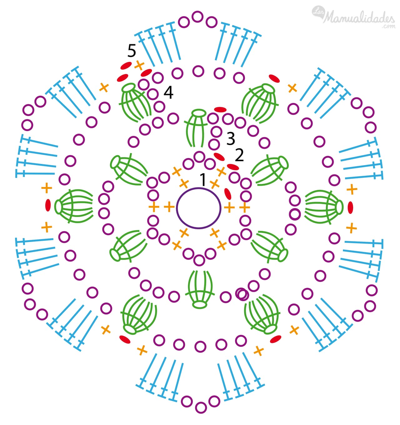 Sigue los indicadores para saber dónde y cuáles son los puntos a realizar para lograr esta flor de crochet.
