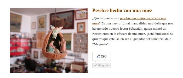 Con un total de 290 “Me gusta”, el maravilloso belén hecho en una nuez que nos envió nuestro lector Sebastián Fabregues se ha consagrado como el gran ganador del Concurso de Manualidades navideñas 2012. ¡¡Muchas felicidades!!