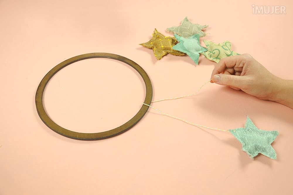 Con hijo y aguja une las estrellas al aro de madera. Procura que tengan distintos largos.