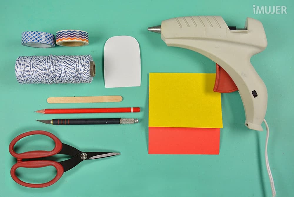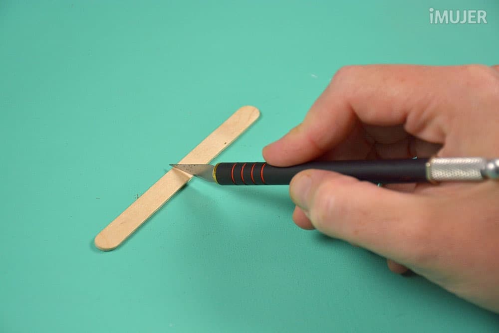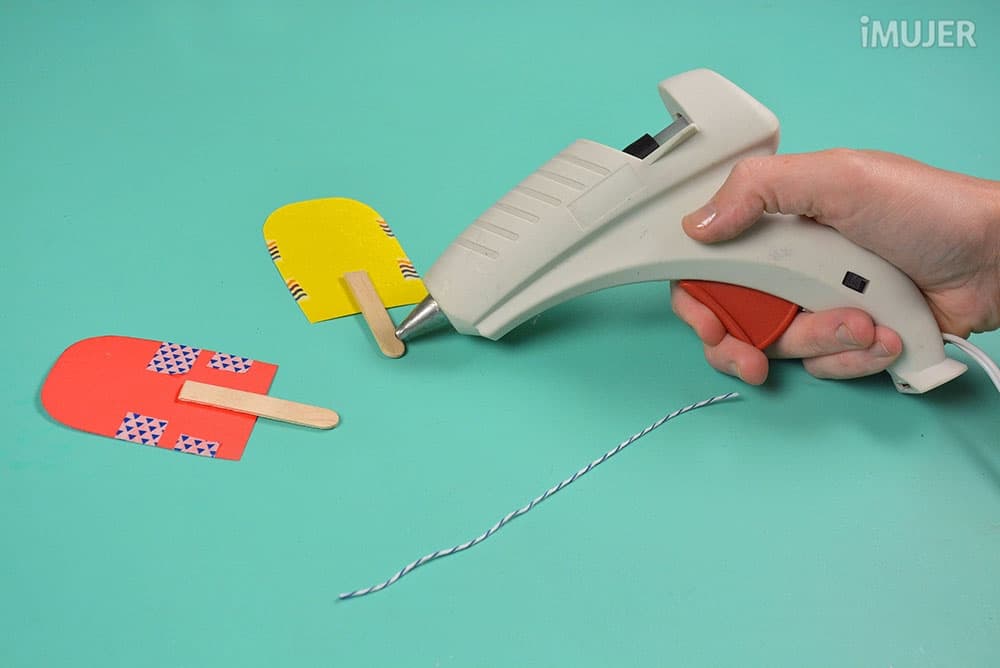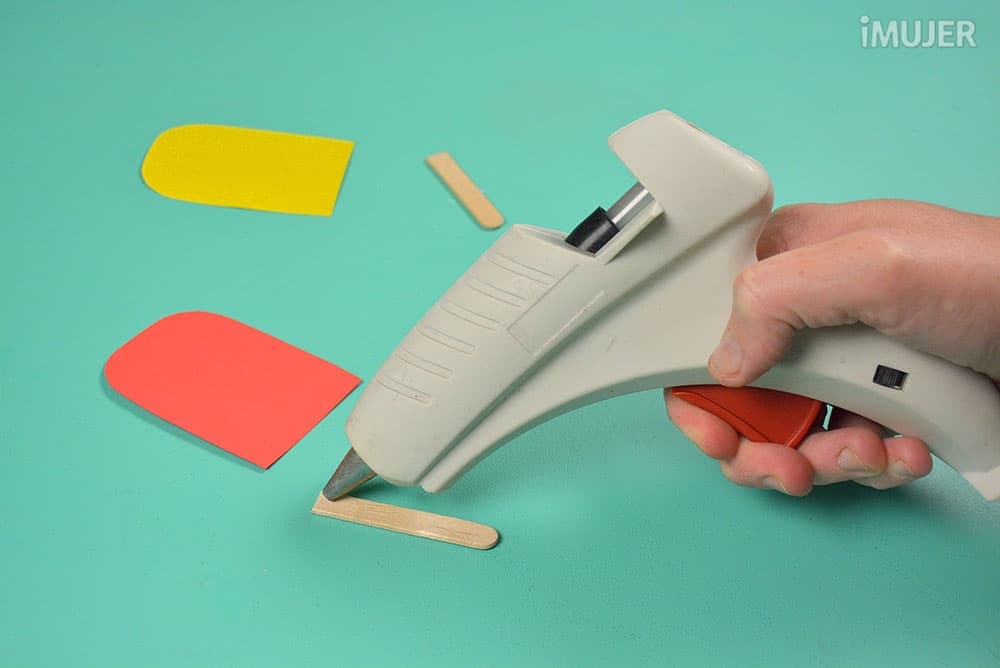 Luego, con una pistola de silicona pega la cartulina encima del palito.