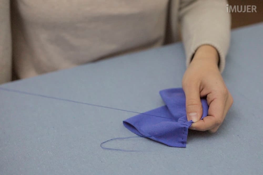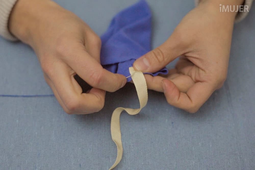 Corta unos 10 cm de cinta y cóselo en la parte superior del bolsito.