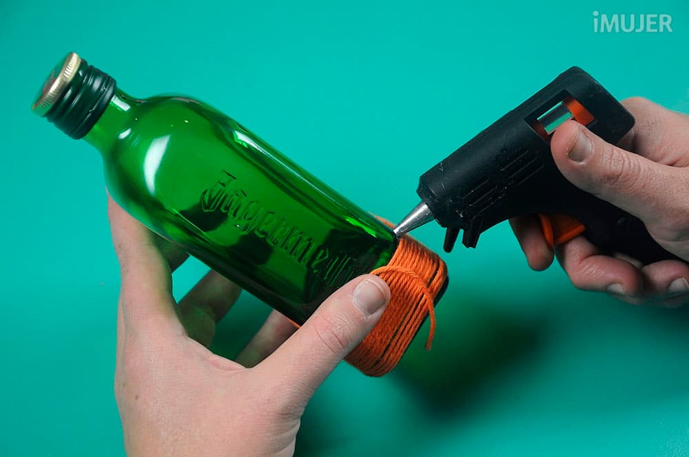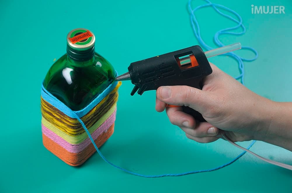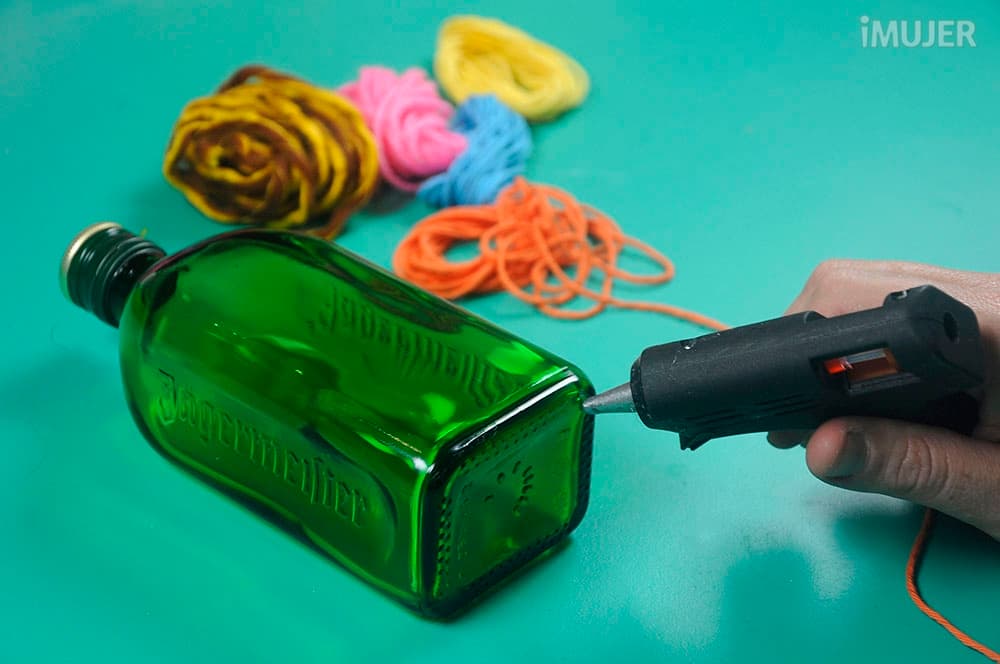 Pon silicona en la base de la botella y pega un extremo de la lana.
