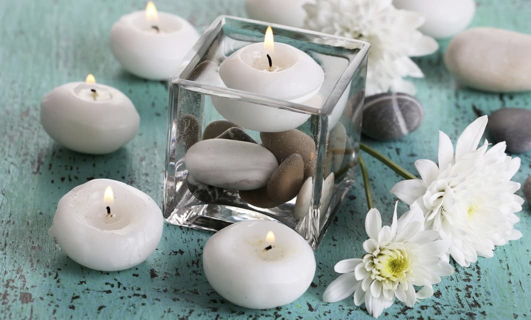 La decoración con velas y piedras de río es perfecta para ti si lo que estás buscando es la armonía. Una idea para decorar con esta combinación es que pongas un poco de arena en dos o tres recipientes grandes de vidrio, luego incrustes algunas piedras de río y entre ellas acomodes dos o tres velas blancas. Si no te gustan las velas blancas puedes usar de otro color.