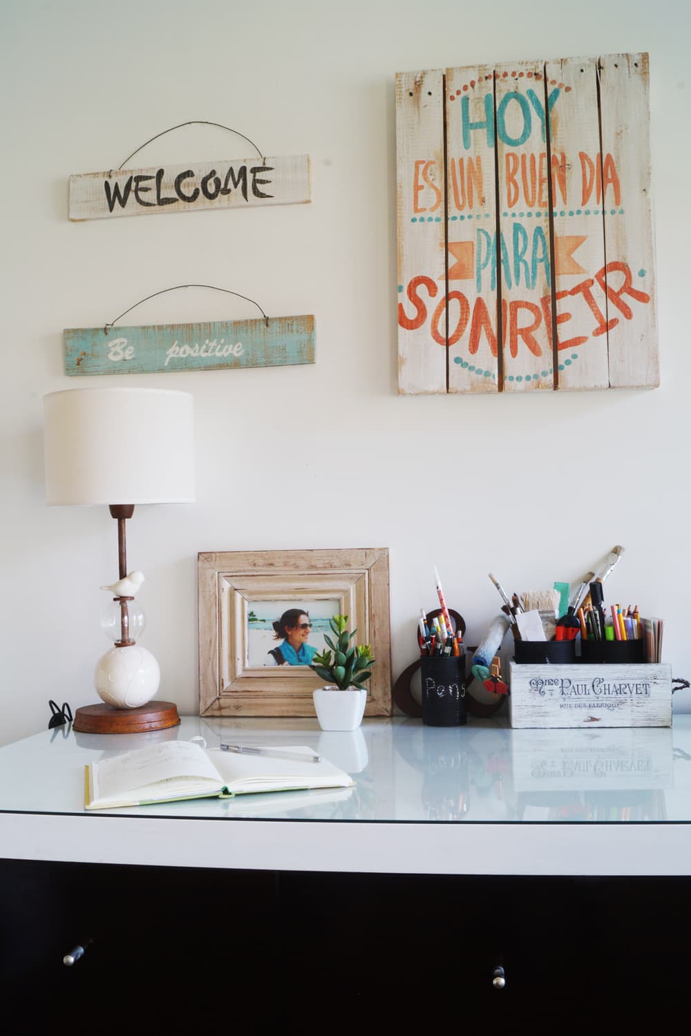 Estos carteles se ven geniales en cualquier parte de la casa. Puedes hacer uno que a ti se te ocurra si tienes algunas tablas de madera vieja guardadas. Sólo debes pintarlas y agregarle tu nombre, una palabra o una frase inspiradora. ¡Se ven muy bien!