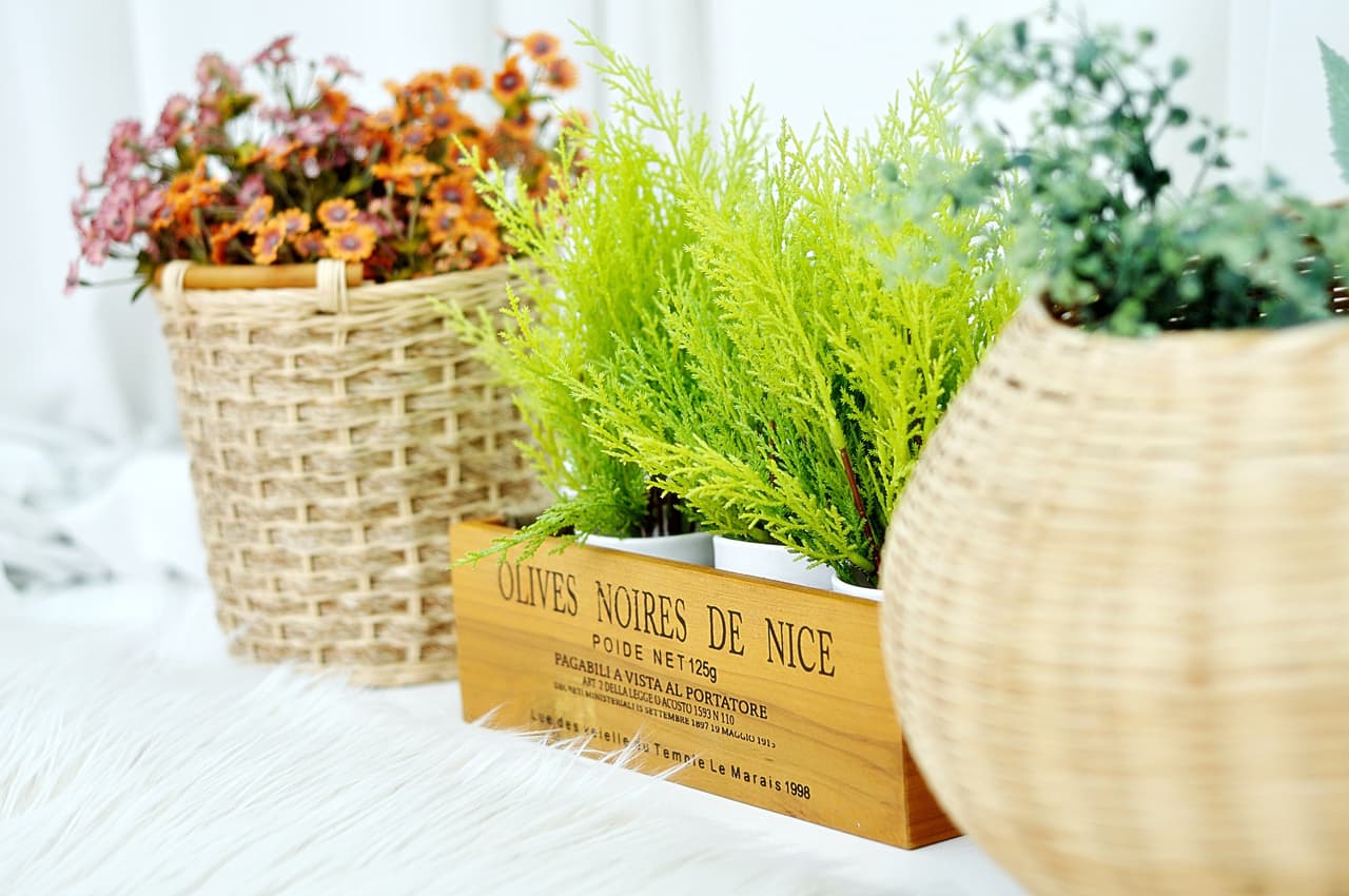 Si tienes una canasta de mimbre o, como en la foto, un cajón de madera, puedes colocar tus macetas allí dentro y disimular si están despintadas o algo rotas.