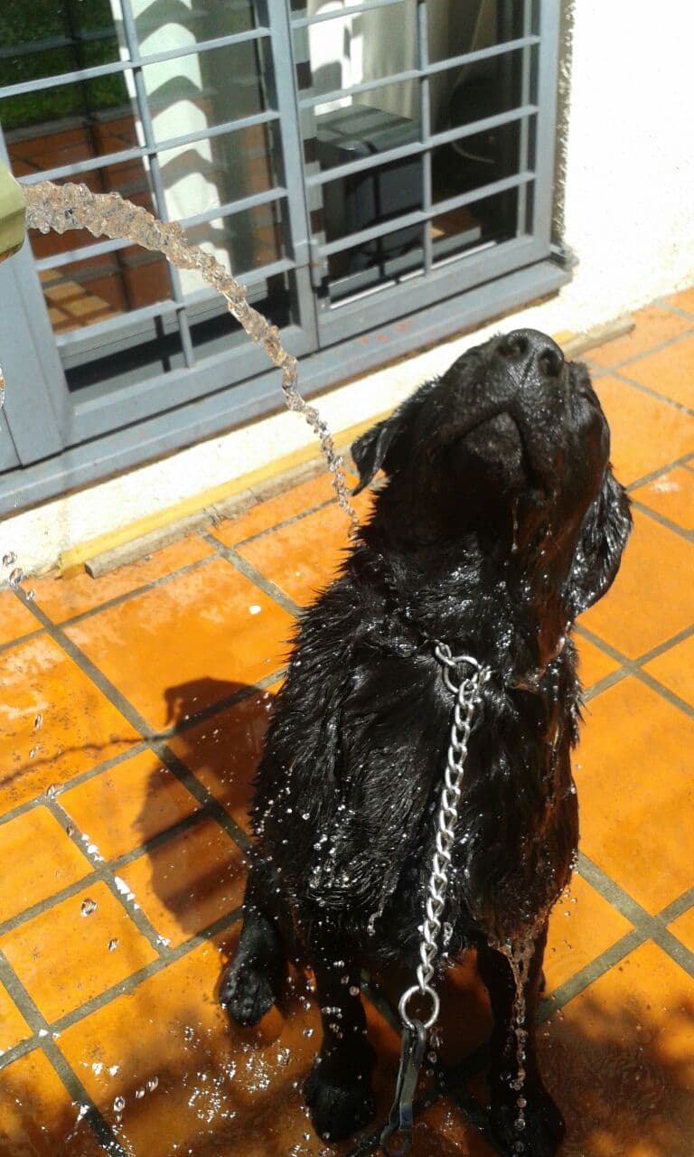 27. Dino adora los largos baños con manguera en los días soleados y más cuando son en compañía de Sofi