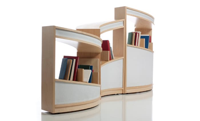 Nautilus es una biblioteca que ofrece un espacio envolvente para el lector, carece de sillas, pero tiene un mullido cojín en el centro. Sus medidas son de 121cm x 170 cm, pero es destacable el hecho de que ésta no sea una pieza rígida, sino que en caso de necesitarse el espacio, puede ser extendido a su forma lineal, con lo que funcionaría como un separador de espacios estupendo. El nautilus es sencillamente encantador. Su diseño sobrio, sus colores neutros, funcionalidad y estéticalo convierten en el rincón ideal para todos aquellos que amamos pasar nuestras horas en compañía de un buen libro.