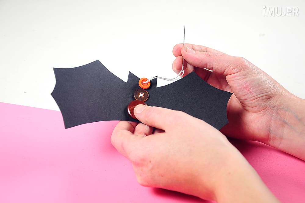 Toma el murciélago recortado y cose los botones con hilo y aguja en el centro.