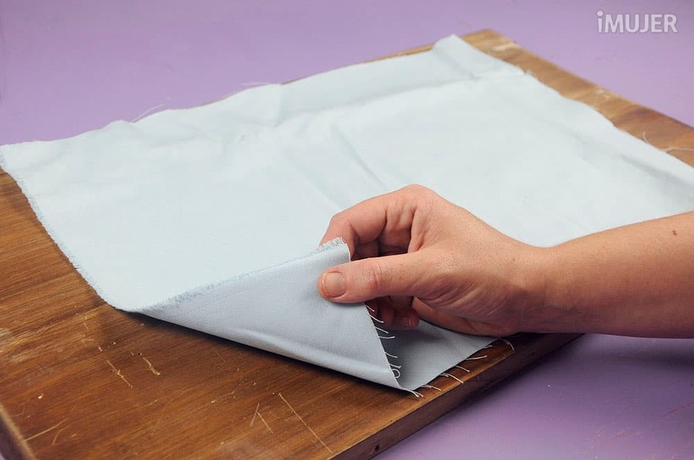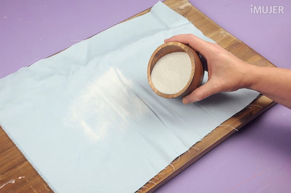 Coloca el retazo de tela por encima de la tabla de madera (hay quienes utilizan un cartón grueso o varias hojas de papel periódico), y luego esparce abundante sal sobre la superficie.