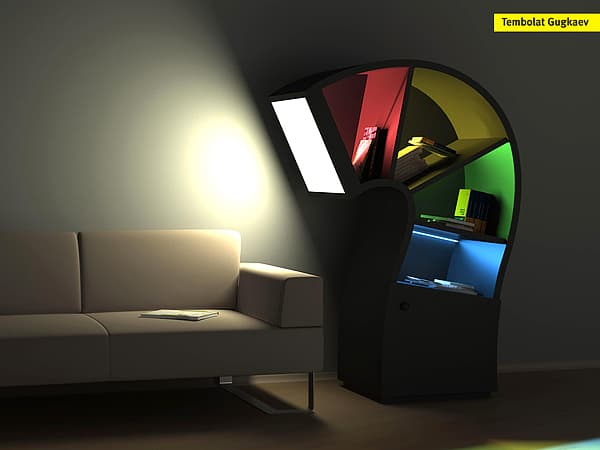 Gugkaev juega, además de con las formas, con la iluminación. Aparte de combinar muebles entre sí combina también el mobiliario con la iluminación. De esta forma, obtiene una pieza sumamente original y decorativa como la biblioteca con forma de signo de interrogación.