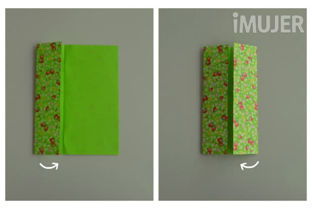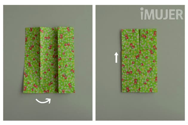 Tomá un papel cuadrado. Hacé una marca por la mitad y doblá las dos solapas hacia el centro, como si fuese una ventana. Si usás papel de origami, acordate de dejar el diseño para afuera.