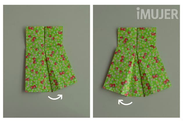 Ahora vamos a hacer la falda. Tomá una de las 2 solapas de la mitad más grande del rectángulo y plegala hacia afuera y un poco hacia arriba. Luego, repetilo con la otra solapa. Ya empieza a tomar forma, ¿viste?
