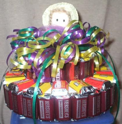 Coloca alrededor del foam, las barras de chocolate y en la parte superior, puedes agregar más materiales según tu creatividad u ocasión. También puedes cambiar las envolturas de los chocolates por unas elaboradas por tí misma, dándole así un toque más original.