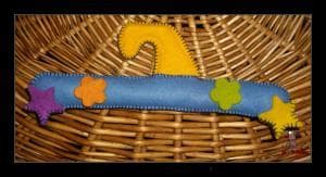 A continuación, cortas en cartulina la forma que quieras darle a la percha y dibujas esa forma en el fieltro de color elegido. Lo recortas un poquito más grande que lo marcado en la tela y lo decoras como quieras.