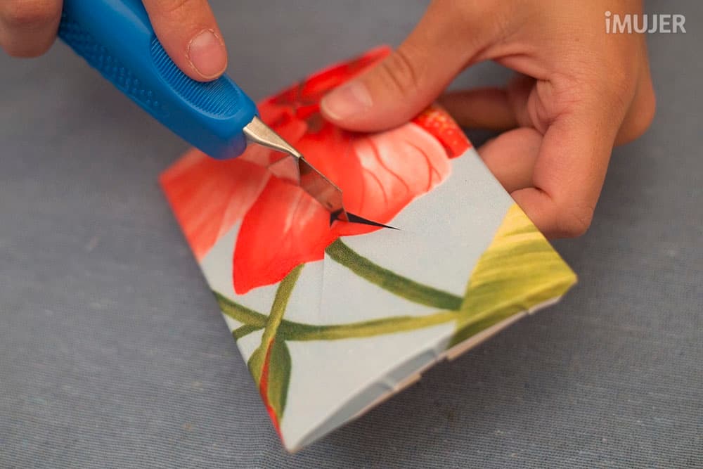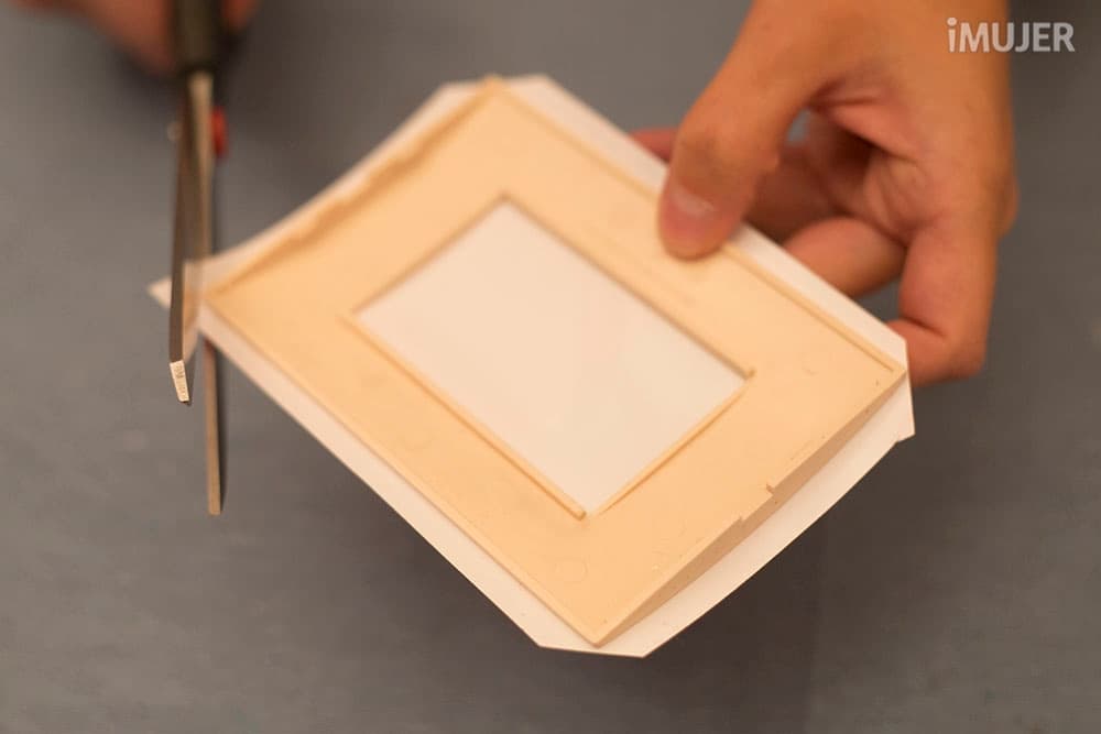 Corta en cruz el adhesivo en la parte del centro. Pliega los picos en la parte trasera de la tapa y recorta el sobrante.