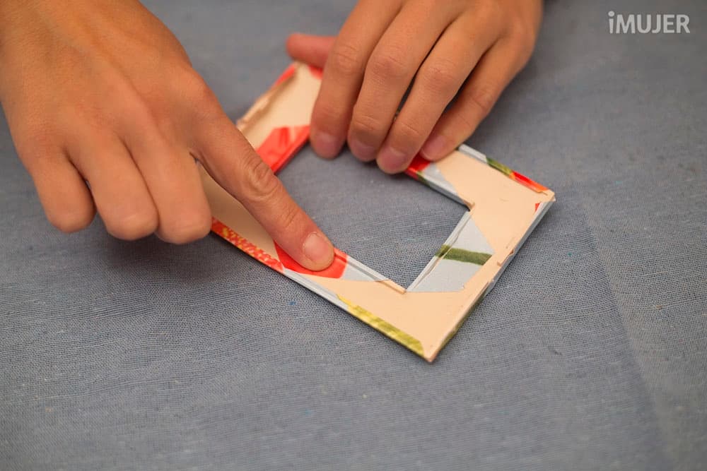 Pega el adhesivo en la zona frontal de la tapa. Recorta las esquinas y pliega los bordes.