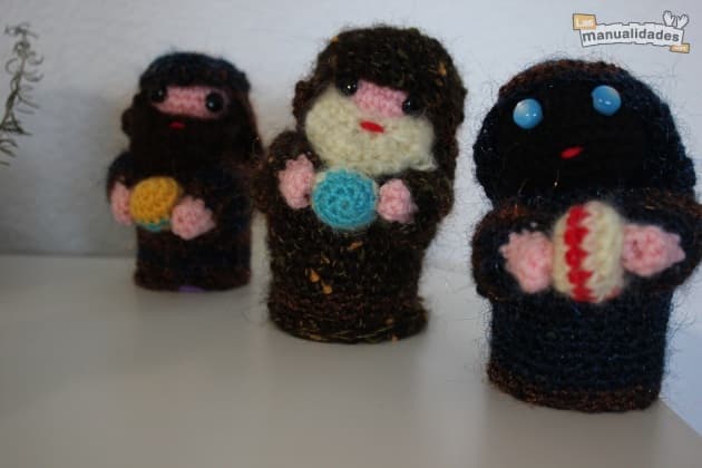 Comienza por los patrones para el cuerpo. Estos no necesitarán relleno de peluche, ya que las bases serán los vasitos de yogur que vayas a utilizar. Deberás usar medio punto (mp) y media vareta (mv).