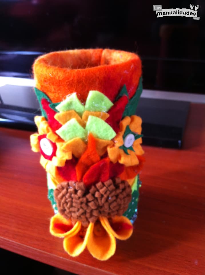 Forra el tarro de papas con un poco de fieltro del color que prefieras y comienza a pegar las figuras que habías realizado anteriormente. Espera que la tela se seque y ¡listo! ¡Ya tienes un fantástico portalápices de fieltro!