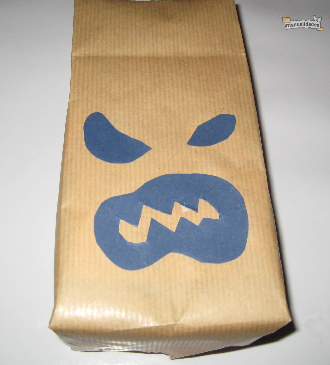 Recortas ojos y boca en cartulina oscura y los pegas en la bolsa.