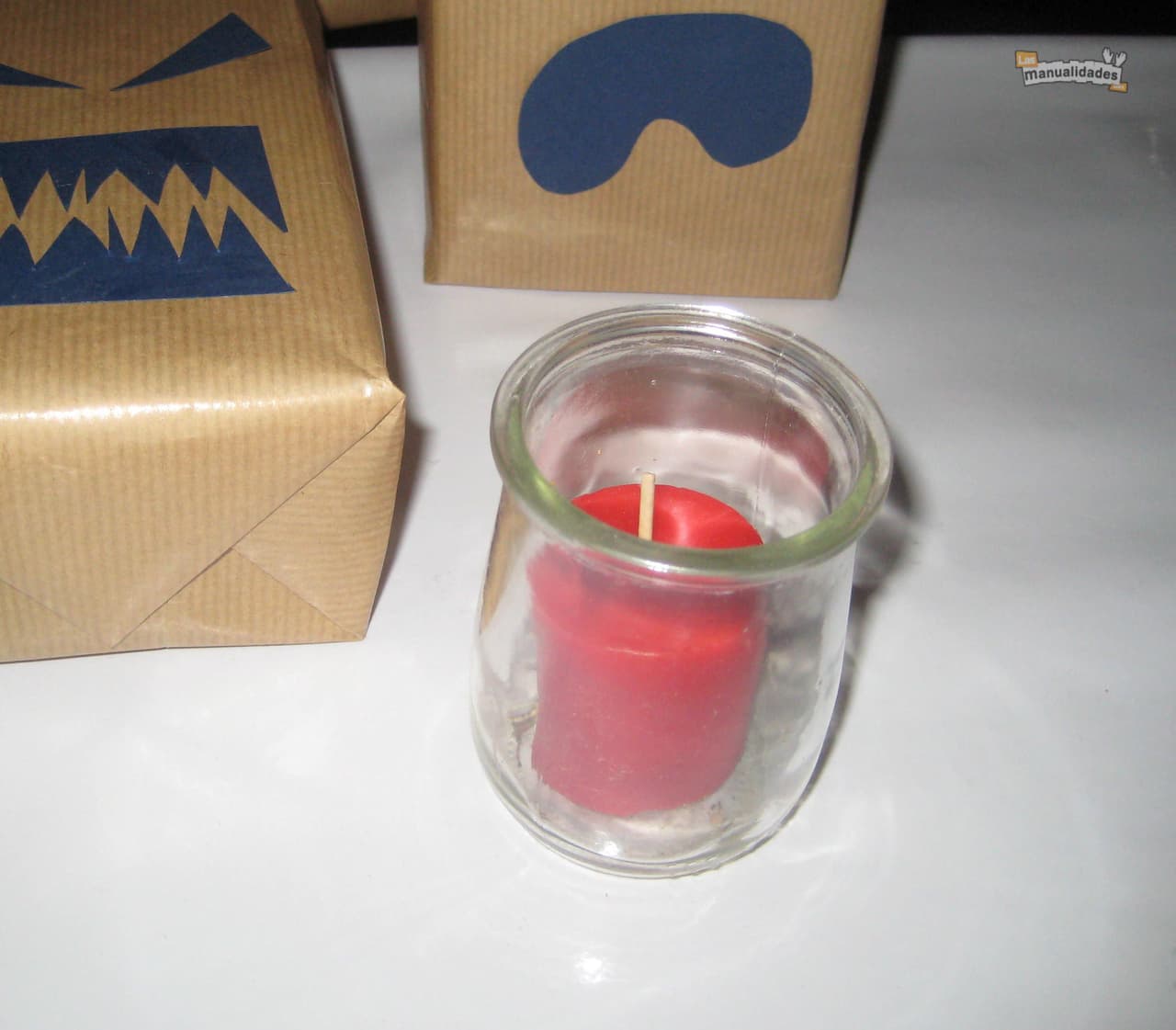 Retiras la caja que te ha servido de molde y colocas en el interior de la bolsa un envase de cristal con una vela en su interior.