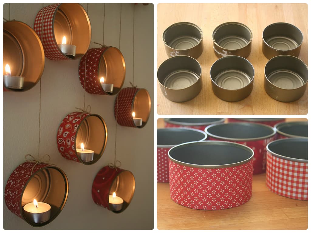 Realiza 3 agujeros en cada lata y pasa un trozo delgado de cuerda por los de los extremos y en el agujero central una cuerda más gruesa y resistente que es el que va a la percha; en la parte interna de las latas anuda la cuerda central y ponle un punto de pegamento o silicona, mientras que con los extremos de la cuerda delgada saliente realiza un nudo decorativo y de paso ayudará a sostener el peso de la vela.