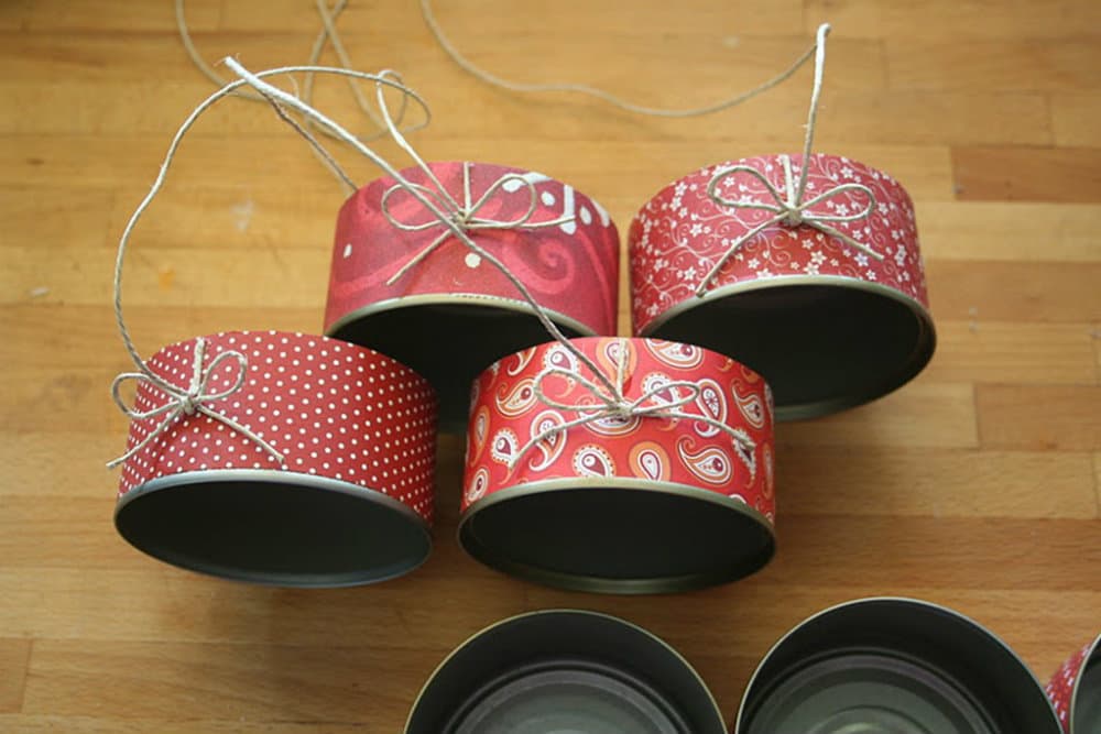 Mira detenidamente que no quede ningún filo peligroso en los bordes de las latas que puedan cortar a alguien, luego procede a cubrir las latas con papel regalo o alguna tela estampada.