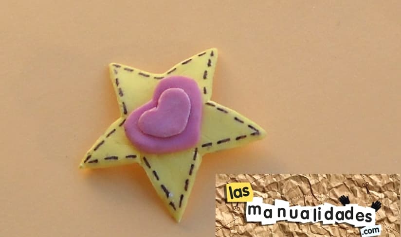 Posteriormente tomamos otro poco de porcelana y la teñimos con témpera rosa, también la aplanamos y luego, con ayuda de una tijera cortamos dos corazones, uno mediano y otro pequeño. Los pegamos con cola vinílica uno encima de otro (como puede verse en la foto) y por último, lo colocamos y pegamos sobre la estrella.