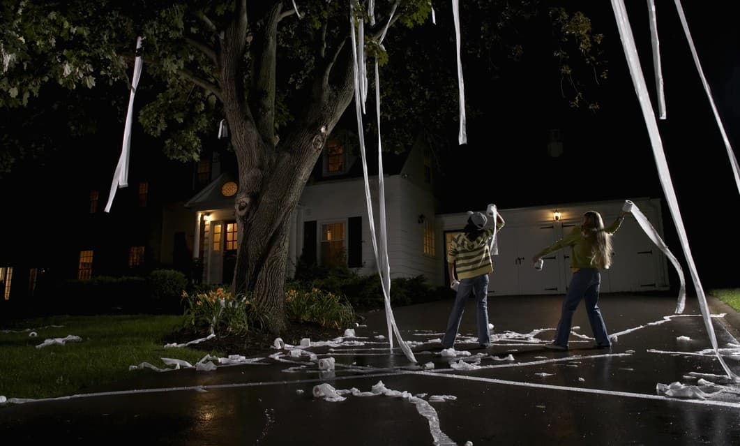 Los árboles empapelados con papel higiénico conviene limpiarlos antes que llueva; el papel mojado puede tomar semanas en salir. Las tiras largas de papel retíralas con una vara, o con el rastrillo del jardín. Para retirar los trozos pequeños, envuelve un extremo con cinta aislante (el lado pegajoso hacia afuera). Baja las bolas de papel higiénico mojado de los árboles con una escoba, y barre todo lo que puedas.