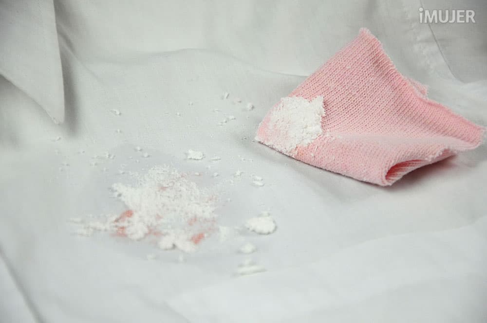 Una un poco de la mezcla sobre una esponja o paño y aplica sobre la mancha de labial. Asegúrate de que cubra muy bien toda la mancha y deja reposar durante 30 minutos.