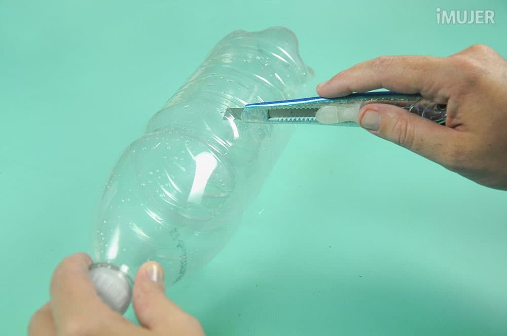 Corta la botella de plástico a la mitad con el cúter. A continuación...