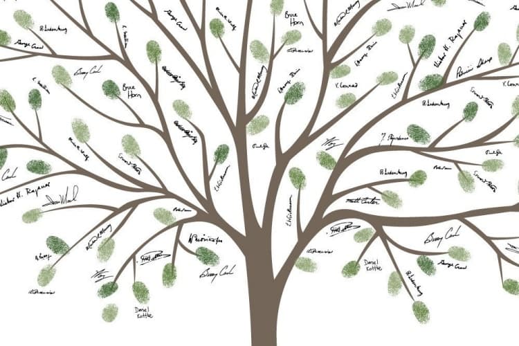 Así queda el árbol una vez que se ha llenado con impresiones de pulgares y firmas. Una vez que se ha completado y lo has llevado a casa, puedes enmarcarlo para colgar.