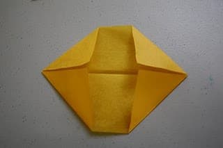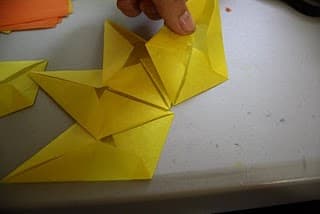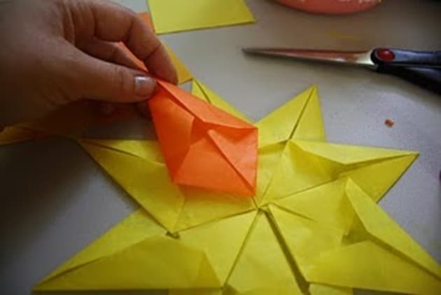 Sigue el proceso de plegado que ves en las imágenes utilizando 8 hojas de papel amarillo, 4 hojas de papel naranja claro y 4 de naranja oscuro.