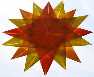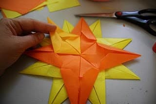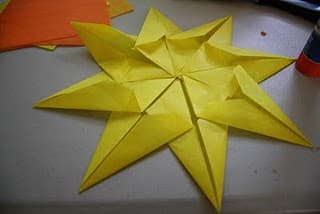 Con la técnica de origami se hace este lindo sol de papel para decorar ventanas, vidrieras o los escaparates de las tiendas. Si utilizamos papel de seda o un papel que permita que pase la luz y lo colocamos en una ventana o tras un foco luminoso, este sol de papel tendrá un brillo magnífico. Anímate a comenzar a mirar papeles al trasluz y hacer un bonito diseño de sol para colocar en tu ventana.