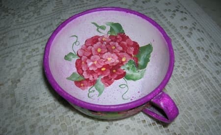 Limpiamos y acondicionamos la taza de lata. Le damos una base de pintura blanca, el borde y el asa de otro color. Yo usé lila para que hiciera juego con la servilleta. Una vez seco adentro hacemos lluvia de color, tomamos un cepillo de dientes, lo humedecemos un poco, sacamos el exceso de agua y lo pasamos por la pintura. Luego pasamos el dedo sobre el cepillo y la pintura va saliendo en forma de lluvia, esto entona el color que dimos de base.