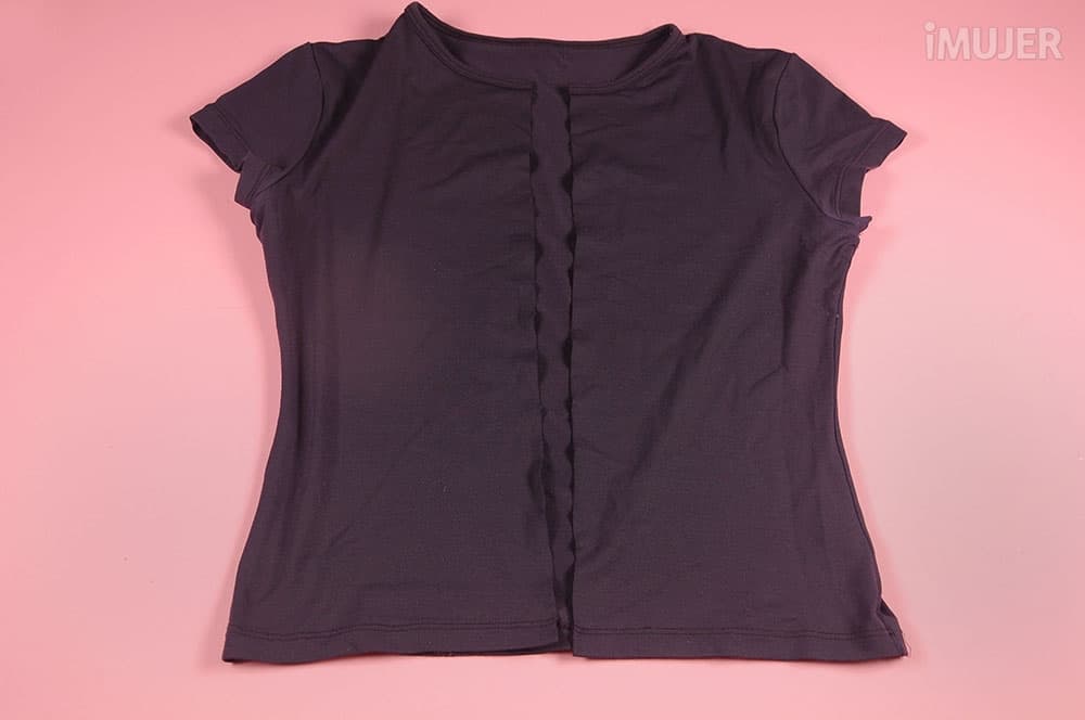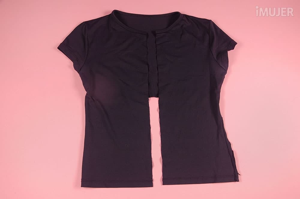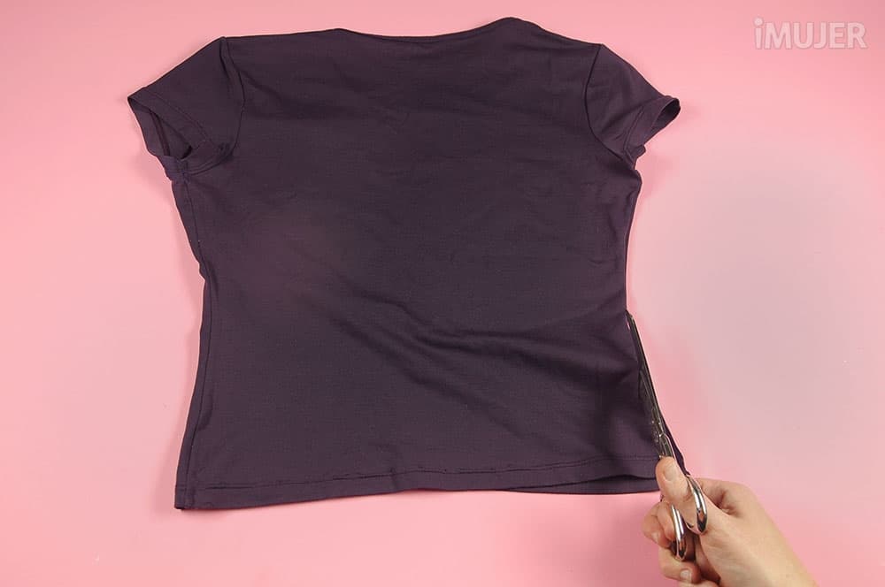 Da vuelta tu camiseta y comienza cortando uno de sus laterales hasta la mitad de la espalda.