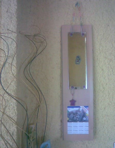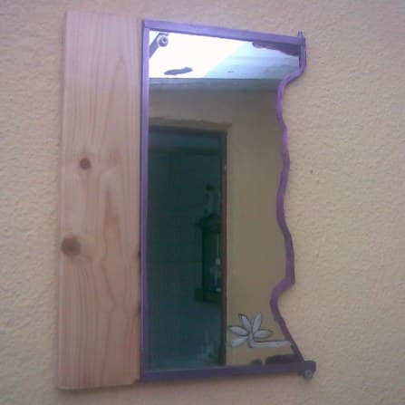 Pegar el espejo en la tabla de madera, dejando un hueco debajo para poner la foto que queramos. A continuación pegar la foto. Hacer una caderna con clips de colorines y engancharla para colgar el cuadro. Otra opcion es pegar un espejo previamente cortado con formas ondeadas en una tabla y decorarla por ejemplo pintando con pintauñas el borde.