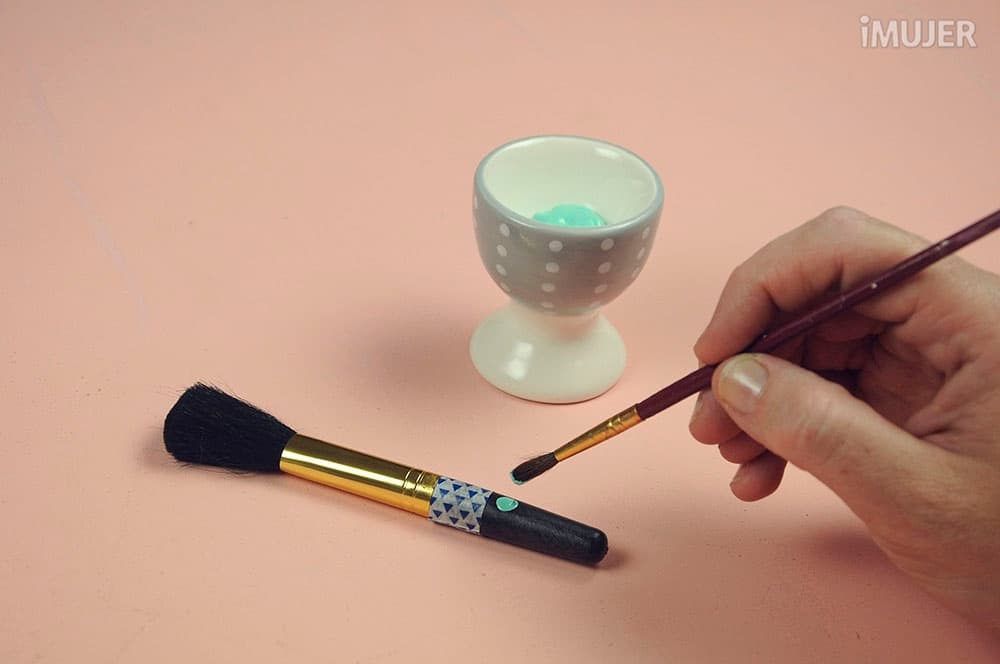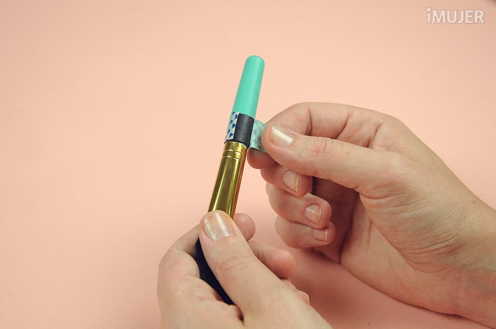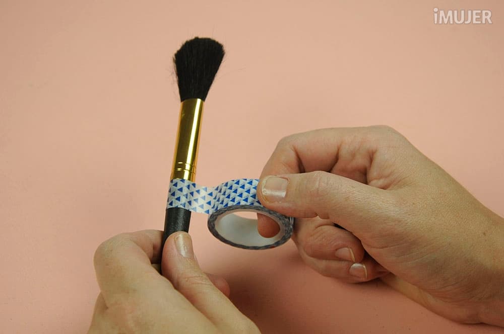 Coloca cinta adhesiva en las brochas para generar un diseño. Te aconsejo hacer el mismo diseño en todas para que luzca más bonito.