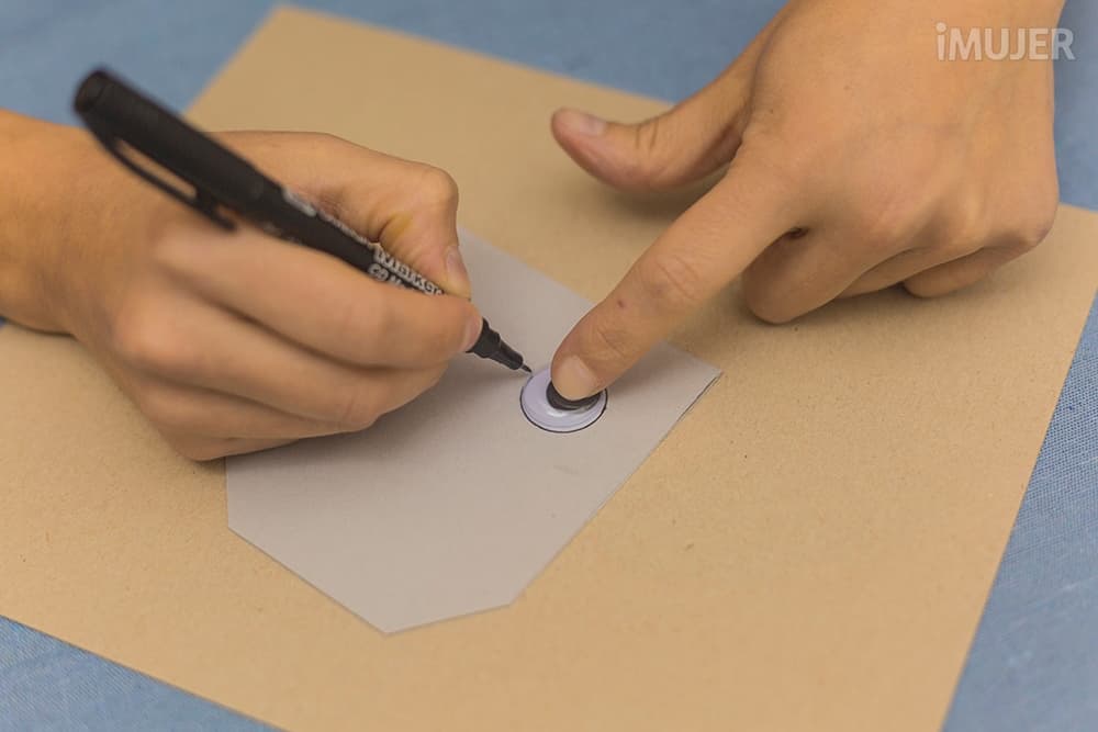Pliega el cartón al medio, dándole forma de tarjeta y corta las esquinas externas. Luego, marca el contorno del ojo en la tapa de la tarjeta.